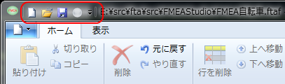 ウィンドウのタイトルバーです。タイトルバーの左にはクイックアクセスツールバーが表示されます。 上の画面ショットはクイックアクセスツールバーの部分です。 クイックアクセスツールバーには、[カストマイズ]プロパティタブで設定することにより、よく使うコマンドが表示できます。 参照: 実行環境/[カストマイズ]プロパティタブ/画面の説明 キーワード: タイトルバー/クイックアクセスツールバー