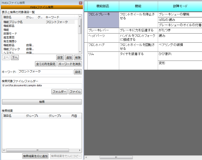を指定して検索することで、過去に作成した他の自転車のFMEA表から、ブレーキに関する故障モード、故障の影響をリストアップすることができます。