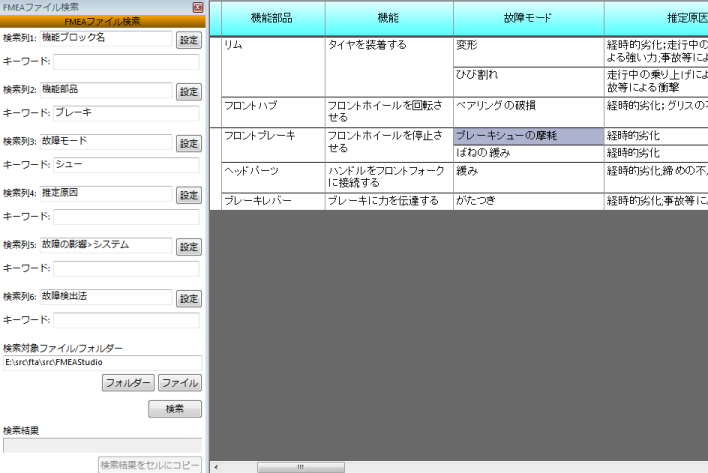 例えば、自転車のFMEA表を作成する場合に、検索列1="機能部品"/キーワード="ブレーキ"、検索列2="故障モード"、検索列3="故障の影響>システム"を指定して検索することで、他の自転車のブレーキに関する故障モード、故障の影響をリストアップすることができます。