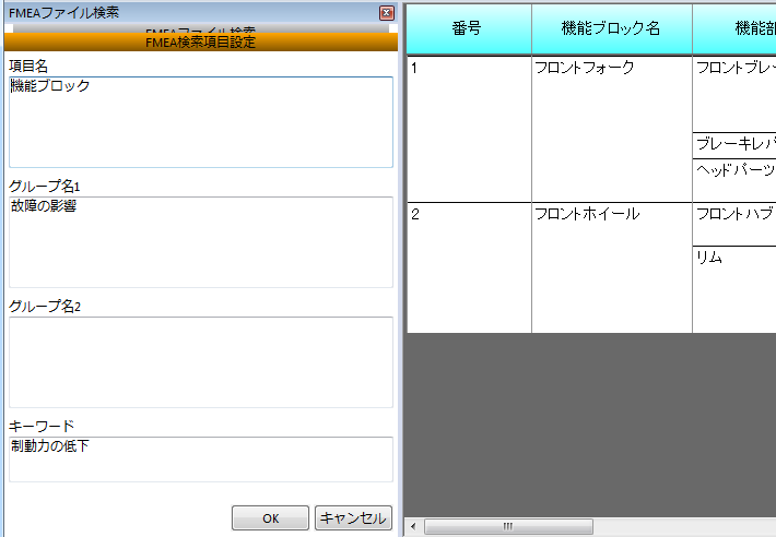 [FMEAファイル検索]ウィンドウの[設定]ボタンあるいは[追加]ボタンをクリックすることで表示されます。 各入力欄には[表示と検索の対象項目一覧]リストで選択されていた項目の情報が初期値として表示されます。 [項目名]入力欄 検索対象列の項目名(列名)が表示されます。また、FMEA表のセルを選択すると、セルが属する列の項目名が設定されます。 項目名は編集可能です。 [グループ名1]入力欄 検索対象列のグループ名1が表示されます。また、FMEA表のセルを選択すると、セルが属する列のグループ名1が設定されます。 グループ名1は編集可能です。 [グループ名2]入力欄 検索対象列のグループ名2が表示されます。また、FMEA表のセルを選択すると、セルが属する列のグループ名2が設定されます。 グループ名2は編集可能です。 [キーワード]入力欄 検索対象列の検索キーワードが表示されます。また、FMEA表のセルを選択すると、セルのテキストが設定されます。 キーワードは編集可能です。 [OK]ボタン 各入力欄のテキストを[FMEAファイル検索]ウィンドウの[表示と検索の対象項目一覧]リストに設定します。 [FMEAファイル検索実行]サブウィンドウを閉じて[FMEAファイル検索]ウィンドウに戻ります。 [キャンセル]ボタン [FMEAファイル検索実行]サブウィンドウを閉じて[FMEAファイル検索]ウィンドウに戻ります。 参照: [FMEAファイル検索]ウィンドウ/サブウィンドウ/サイドウィンドウ キーワード: [FMEA検索項目設定]サブウィンドウ