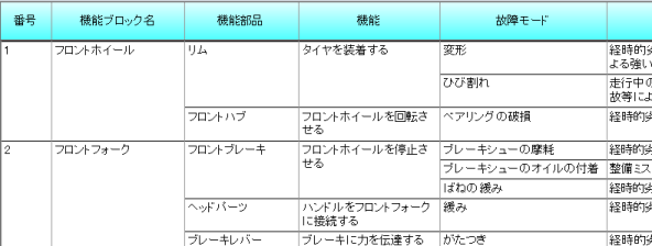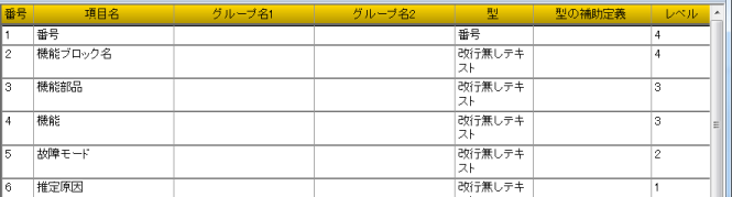 例えば下図の場合、各列の項目レベルは[故障モード]=1、[機能]=2、[機能部品]=2、[機能ブロック名]=3、[番号]=3 となります。