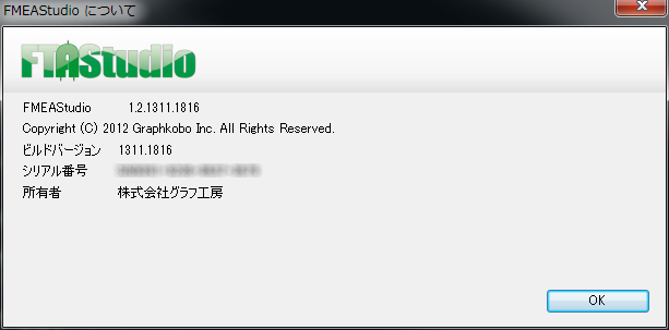 FMEAStudioのバージョン情報、シリアル番号、ライセンス保有者の情報が表示されます。 [OK]ボタン [FMEAStudio について]ダイアログを閉じます。 参照: [オプション]ダイアログ/[バージョン/ライセンス情報]コマンド キーワード: [FMEAStudio について]ダイアログ